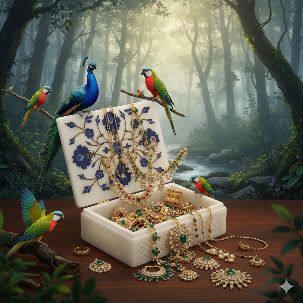 Material - Primarily white marble, inlaid with stones like lapis lazuli, turquoise, carnelian, and jasper.