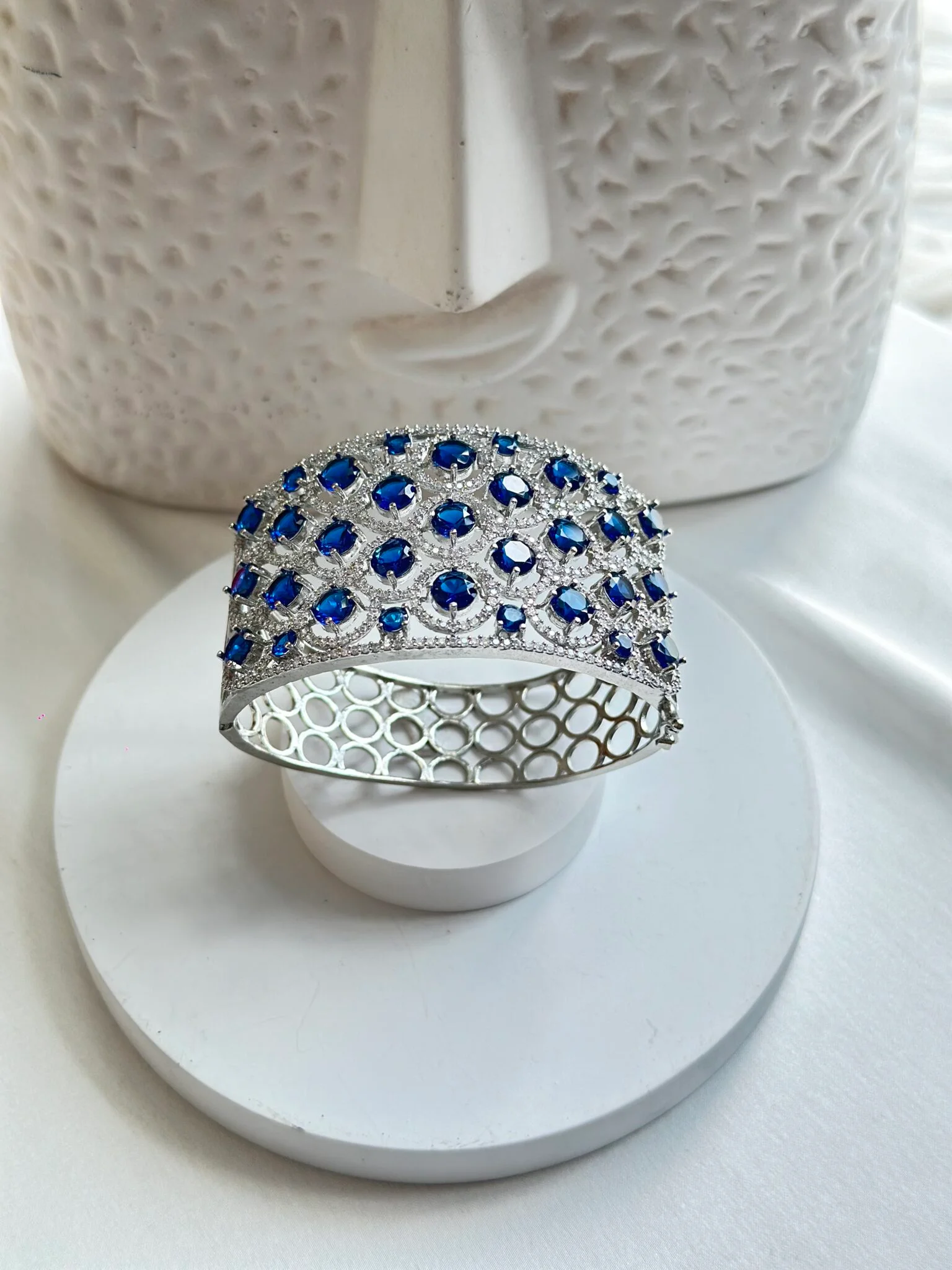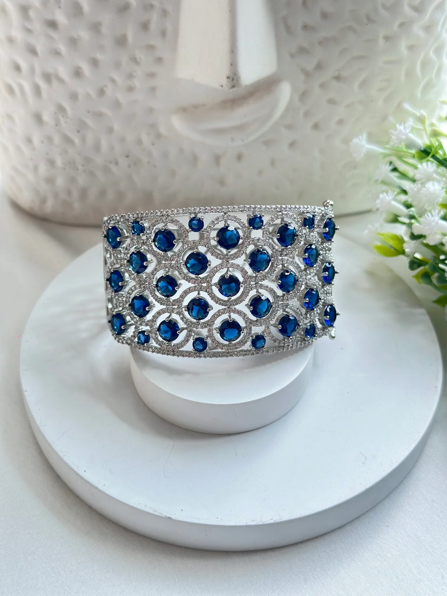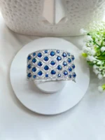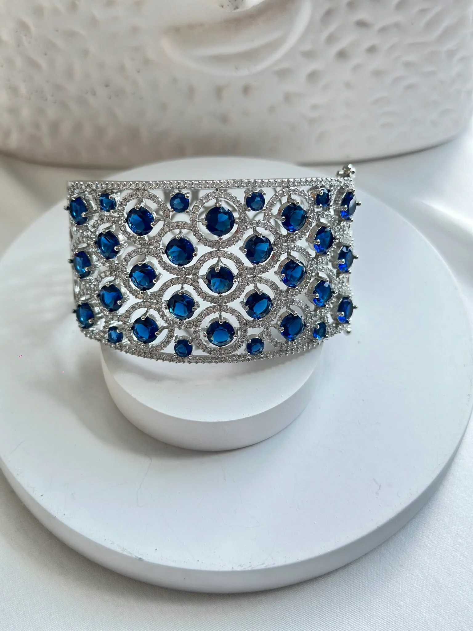 Make a statement with this exquisite bracelet featuring a stunning combination of deep blue gemstones and dazzling clear stones, elegantly set in a luxurious silver-toned metal base.