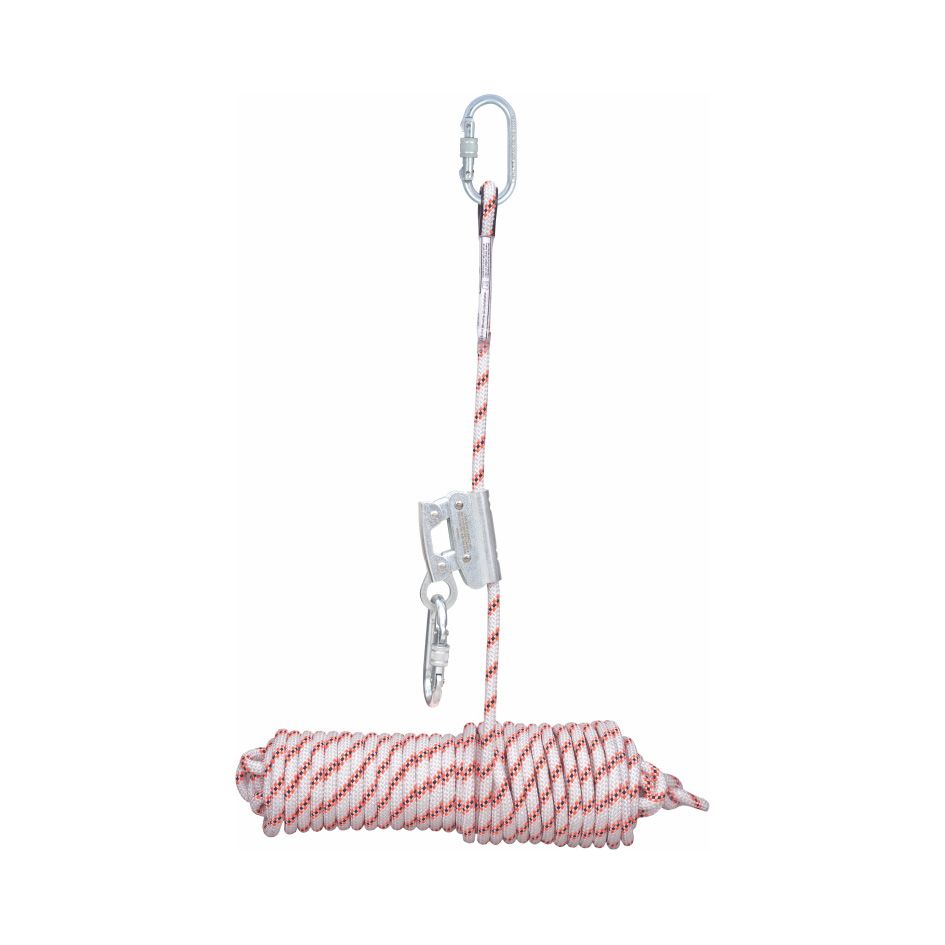 This Fall Arrester works on 12 mm dia Kernmantle Polyamide Rope Anchorage Line incorporated permanently on the anchorage line.